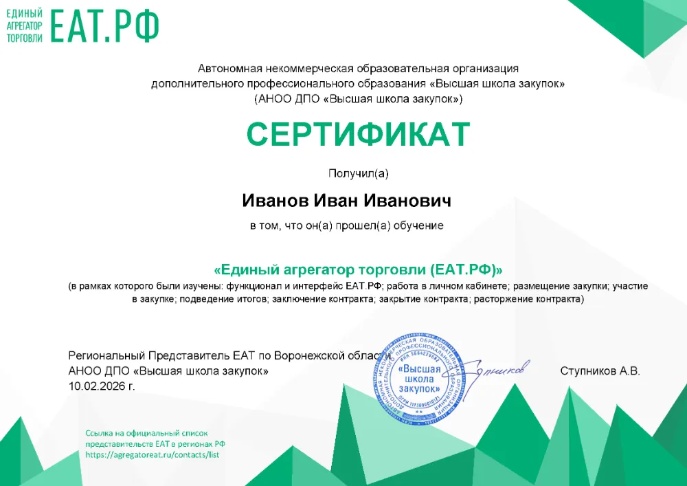 Освойте закупки на уровне цифровых стандартов Республики Татарстан. Мы обучаем работе в ЕИС и на федеральных ЭТП (включая АГЗРТ) с учетом всех обновлений 2026 года. Интерактивный симулятор Высшей школы закупок (fz44.org) позволяет специалистам Казани оттачивать навыки публикации процедур и заключения контрактов в цифровом виде без риска совершить ошибку.