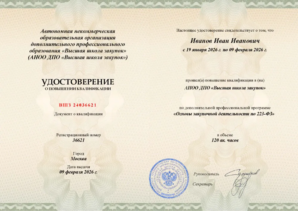 Вы получаете официальное удостоверение о повышении квалификации. Высшая школа закупок (fz44.org) в обязательном порядке вносит сведения об обучении в Казани в реестр ФИС ФРДО, подтверждая легитимность вашей подготовки перед контролерами.